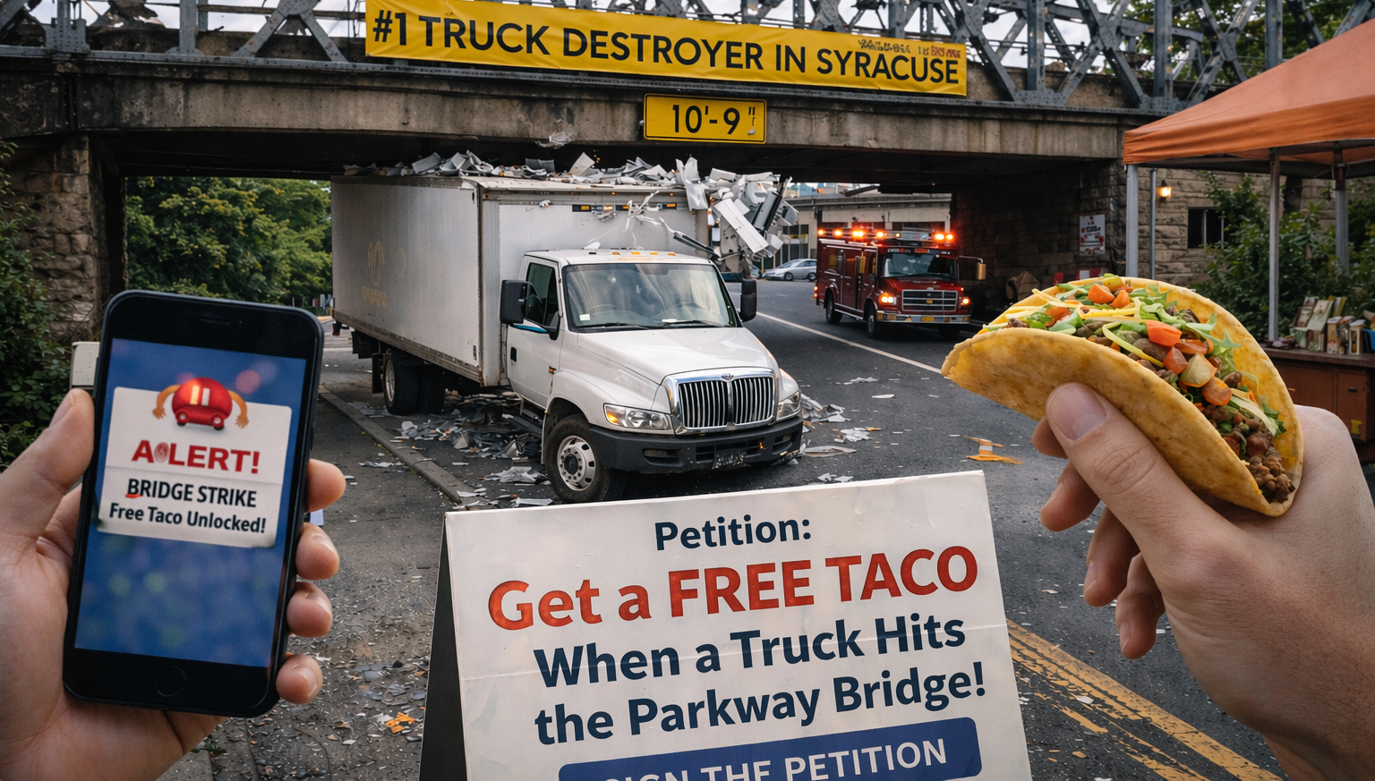 Syracuse is about to turn bridge collisions into a taco-loving bonanza. The city’s famous “Truck Magnet” – also known as the Onondaga Lake Parkway Bridge – is transforming its accident-prone reputation into a hilarious promotion that’s sure to make anyone’s day a bit brighter. Brace yourselves for free tacos each time a truck’s roof kisses… Continue reading Petition: Every Time a Truck Hits the Parkway Bridge, You Can Get A Free Taco